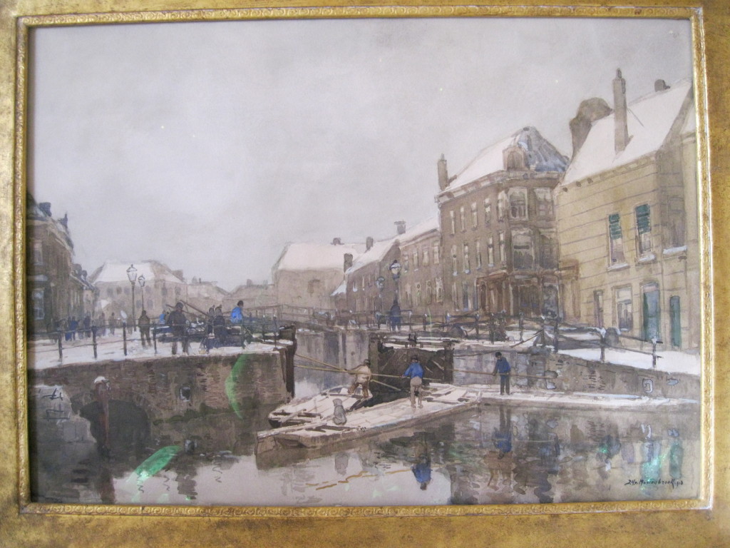 De beurs (De Korenbeurs) is niet te zien, omdat de locatie van waaraf is geschilderd, zich vóór de Korenbeurs bevindt. Dat is een interessant gegeven, omdat de meeste aquarellen/schilderijen van dit plekje juist van de tegenovergestelde zijde (met de Korenbeurs in beeld) zijn geschilderd.Dan tenslotte nog het water. De sluis – dus ook de locatie van de brug – verbindt de Schie met de Lange Haven.