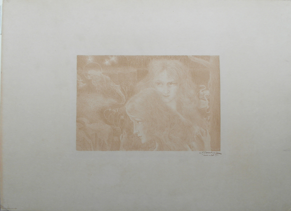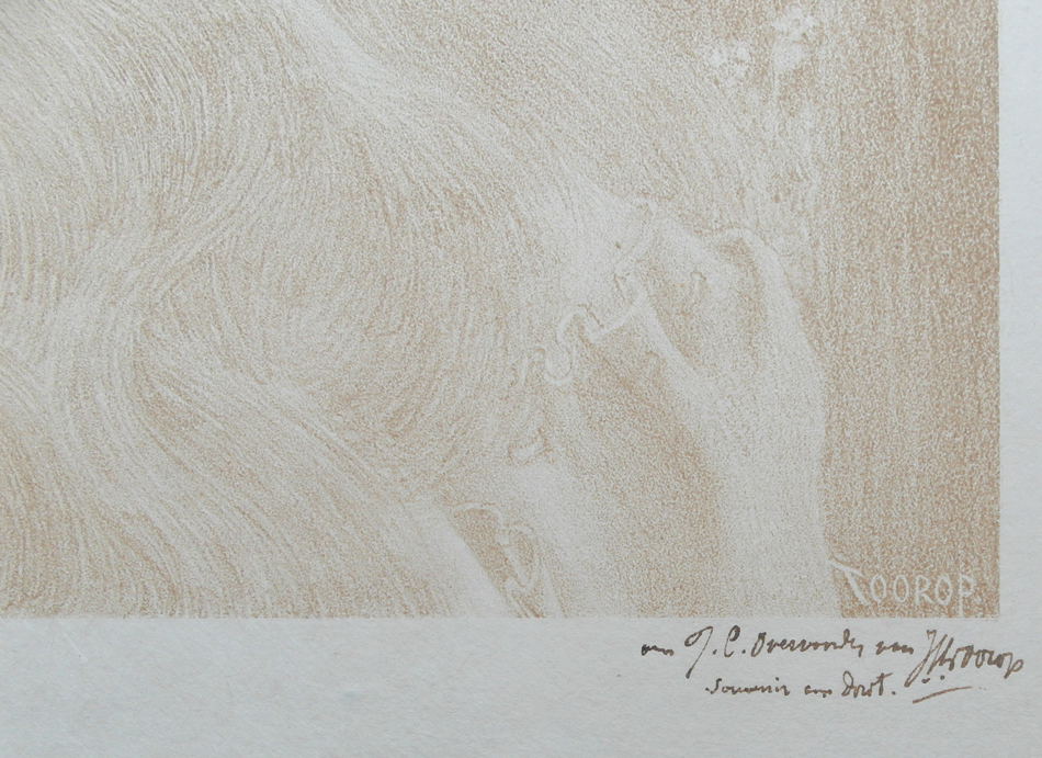 J.H. Toorop ( 1858 Poerowordjo-1928 Den Haag ), litho in bruin, afm. 21,88 x 33,1 cm ( het gehele blad 70 x 50 cm ), gesigneerd rechts onder en buiten de plaat gesigneerd en annotatie voor J.C. Overvorden van J.H. Toorop, souvenir en Dort VERKOCHT
