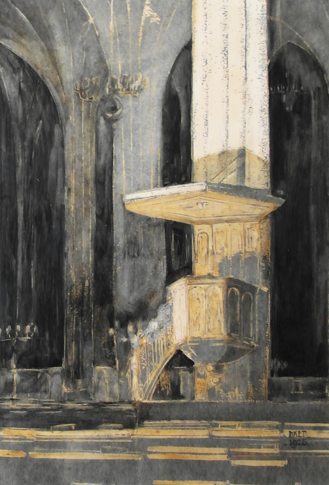 Interieur Eusebiuskerk, Arnhem D. Ket ( Den Helder 1902 – 1940 Bennekom ), Olieverf en krijt op papier, zogenaamde gomtekening, 56 x 38 cm, gesigneerd rechts onder en 1926. Herkomst : Sneep ’29 Breda, altijd in de familie gebleven. VERKOCHT Lees meer over Ket, D. Dit werk is niet meer te koop › Bekijk actueel werk van deze kunstenaar