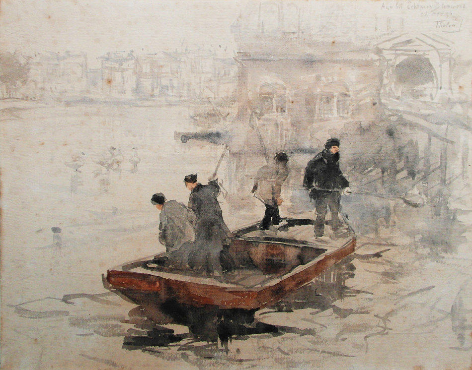 W.B. Tholen ( Amsterdam 1860 – 1951 Den Haag ), aquarel, 34 x 44 cm, gesigneerd rechts boven met annotatie : Aan het echtpaar Blommers 24 dec ’96. Op achterzijde : L.J. Krüger W.B. Tholen, Vijverberg ’s Gravenhage VERKOCHT
