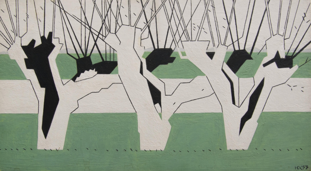 ‘Wilgen’ opus 34 H. Valk (Zoeterwoude 1897 – 1986 Arnhem), olieverf op paneel, 15 x 28 cm, gemonogrammeerd rechts onder en gedateerd ’53. Herkomst : Familie van de kunstenaar. VERKOCHT Lees meer over Valk, H. J. Dit werk is niet meer te koop › Bekijk actueel werk van deze kunstenaar