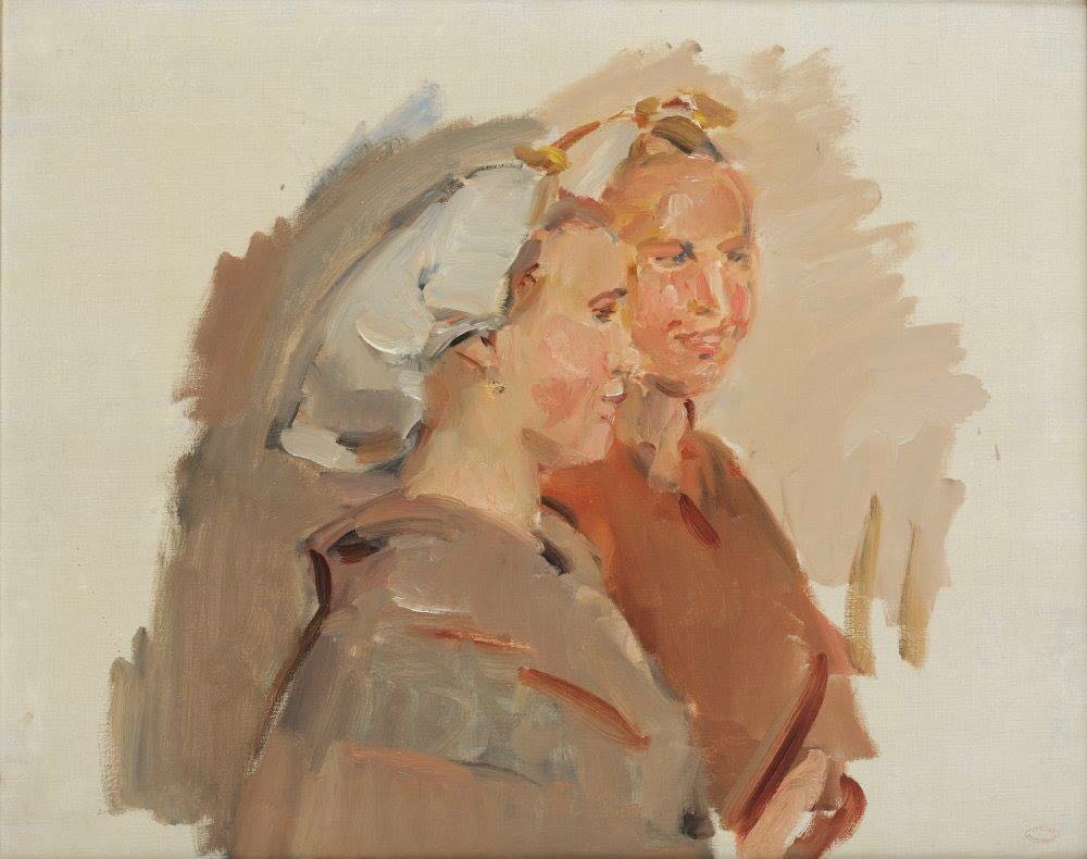 Het werk is een olieverfschets waarop twee Scheveningse jonge vrouwen in dracht staan afgebeeld. Dit schilderij uit particulier bezit was in 2008 al tijdelijk in Muzee te zien tijdens de tentoonstelling ‘Schilderen en wonen op Scheveningen’. Een van de bezoekers, de heer Jan Spaans uit Assen, herkende toen op het schilderij zijn moeder Arendje Roeleveld (1909-2008). Ze had het vaak verteld. Gezellig gearmd, wandelend over de Boulevard met haar vriendinnen Engeltje Westerduijn (geb. 1903) en Anna Post werden zij door de beroemde kunstschilder Isaac Israels gevraagd voor hem te poseren. Natuurlijk moesten hun ouders toestemming geven. De ouders van Engeltje en Arendje vonden het goed, op voorwaarde dat een bekende van de familie bij het poseren aanwezig zou zijn. Na het poseren vroeg Israels aan Arendje of hij haar omslagdoek mocht lenen voor de verdere uitwerking van het schilderij. Kort erna in oktober 1934 overleed plotseling de kunstschilder na een aanrijding door een auto op de Koninginnegracht in Den Haag. De omslagdoek heeft Arendje jammer genoeg nooit teruggekregen. Bij navraag bleek het kledingstuk in de erfenis te zijn opgenomen.