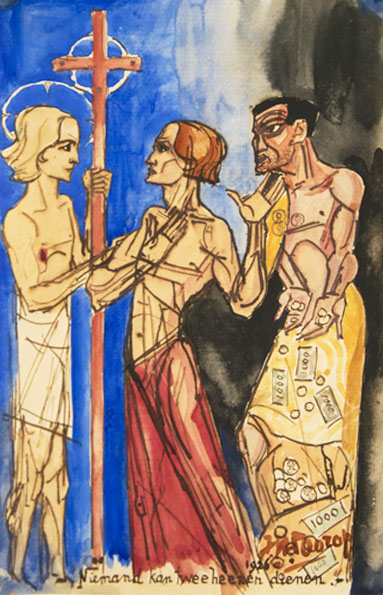 J. Toorop (Poerworedjo 1858 – 1928 Den Haag), bruine inkt en aquarel, 21 x 13,5 cm, gesigneerd en gedateerd rechts onder 1926, met annotatie Niemand kan twee heeren dienen VERKOCHT