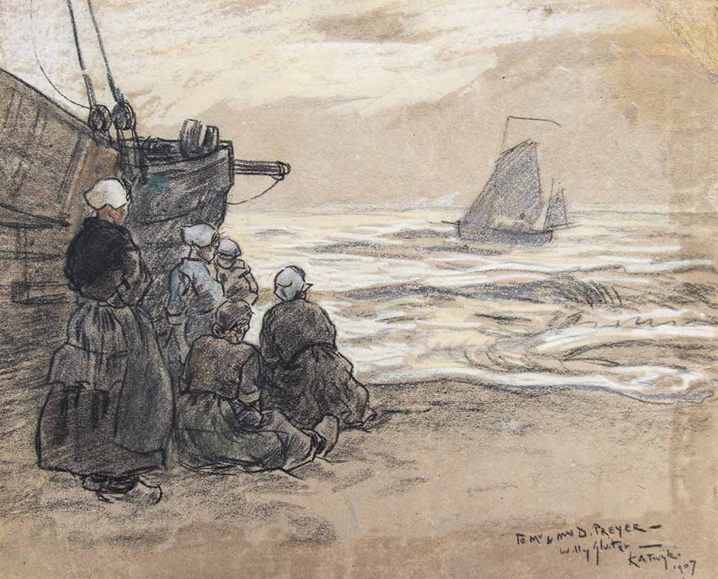 W. Sluiter (Amersfoort 1873 – 1949 Den Haag), zwart en gekleurd krijt, 29 x 36 cm, gesigneerd rechts onder en gedateerd Katwijk 1907, met annotatie to Mr. & Mrs. A. Preyer. VERKOCHT