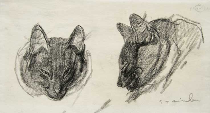 Het meest beroemd wordt Steinlen door zijn liefde voor katten. Iedereen kent zijn archaïsche zwarte kater die gezeten op een rode ondergrond het cabaret van Le Chat Noir aankondigt. Het affiches dat hij maakt voor dit populaire cabaret wordt hét symbool van Montmartre. Op zijn schilderijen en tekeningen verschijnt de kat in allerlei gedaanten: vals, sierlijk en speels. Steinlen is gecharmeerd van het karakter van het dier.