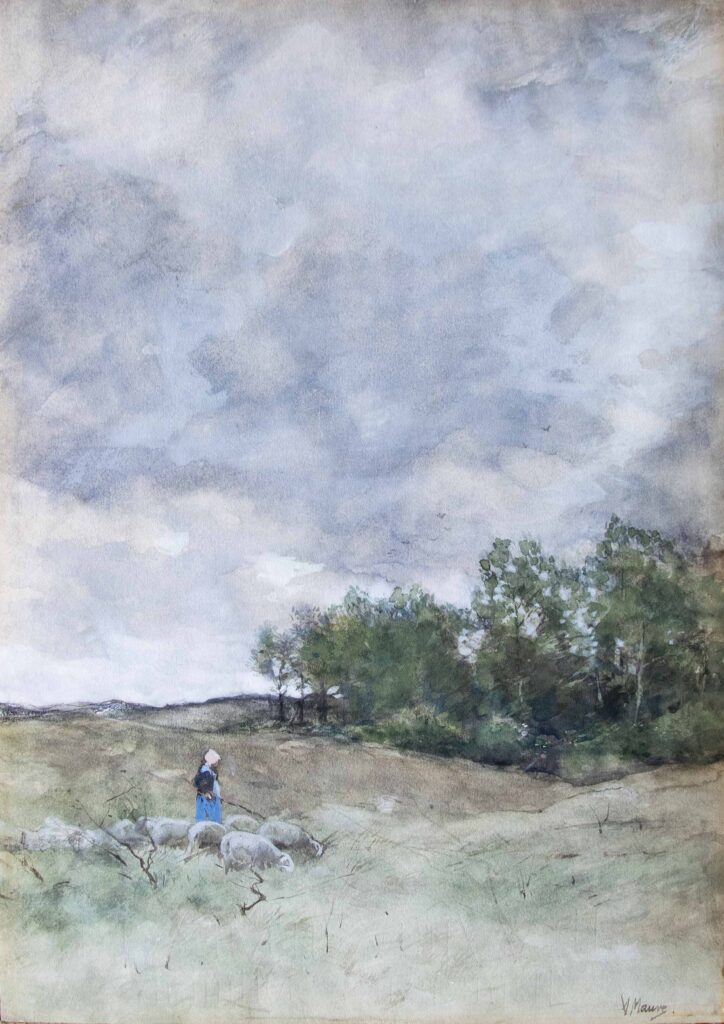 A. Mauve (Zaandam 1838 – 1888 Arnhem), zwart en gekleurd krijt, 24 x 37 cm, gesigneerd rechts onder VERKOCHT