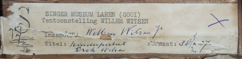 Sticker achterzijde : Singer Museum Laren (Gooi) Tentoonstelling Willem Witsen, inbrenger Willem Witsen Jr., titel Kinderportret Erik Witsen