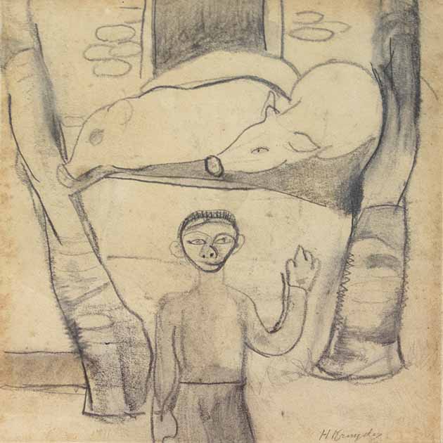Vanaf 1916 ontwikkelde Kruyder zich tot modernist met een geheel eigen expressionistische stijl met platte vlakken, zware contouren en intense kleuren. Zijn voorstellingen varieerden van betoverende, idyllische taferelen waarin de verwondering over de schoonheid van de natuur doorklinkt, tot, in later werk, nachtmerrieachtige scènes die zijn eigen angsten en geestelijke inzinkingen weerspiegelen. Herman Kruyder hield van de stilte in landelijke dorpen als Heemstede, Bennebroek en later Blaricum. Hij vond er zijn onderwerpen : het dorp en de mensen, dieren, bomen en bloemen. In de loop van de jaren twintig veranderde het karakter van zijn werk sterk. De aanvankelijk poëtische taferelen van mensen, dieren en natuur, werden steeds beklemmender.