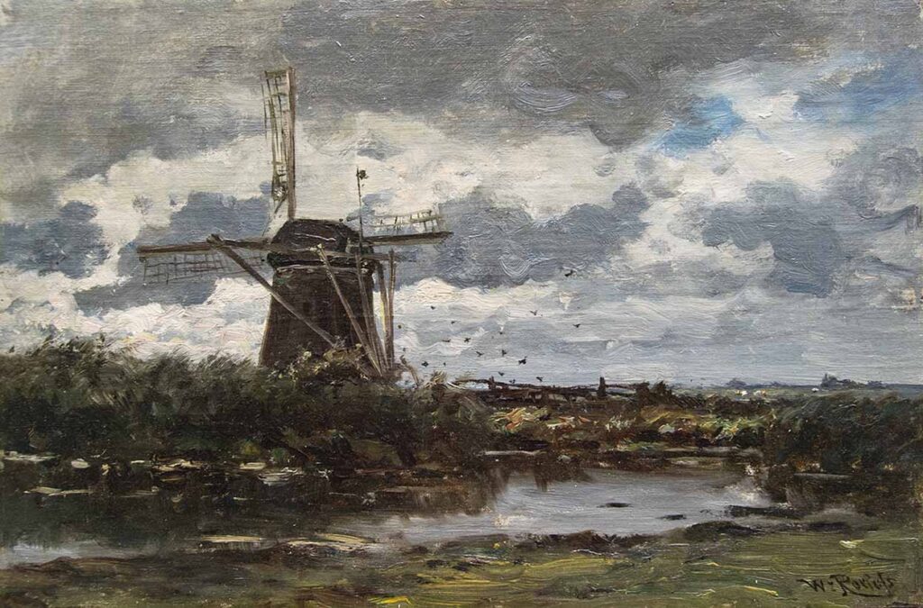 Willem Roelofs wordt beschouwd als de initiator van de Haagse School. Hij was net als Johan Hendrik Weissenbruch en Paul Gabriël een groot voorstander van het schilderen in de vrije natuur. In 1840 ging Roelofs in de leer bij Hendrik van de Sande Bakhuyzen. Met hem maakte hij in 1941 een studiereis door Duitsland. In 1847 verhuist Roelofs van Den Haag naar Brussel. In de jaren dat hij in Brussel woonde (1847-1887) vormde Roelofs een schakel tussen de Franse landschapsschilders van Barbizon en de vooruitstrevende Nederlandse landschapsschilders in Den Haag. Hij bezocht Barbizon meerdere keren en ook de bossen van Fontainebleau. Voor zijn weidelandschappen met koeien en Hollandse wolkenluchten reisde hij regelmatig vanuit Brussel naar Nederland, naar Drenthe, langs de Gein en de Nieuwkoopse plassen.