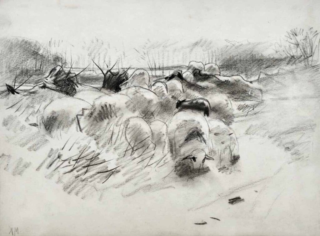A. Mauve (Zaandam 1838 – 1888 Arnhem), zwart krijt met wit gehoogd, 24 x 32,5 cm, gemonogrammeerd linksonder VERKOCHT