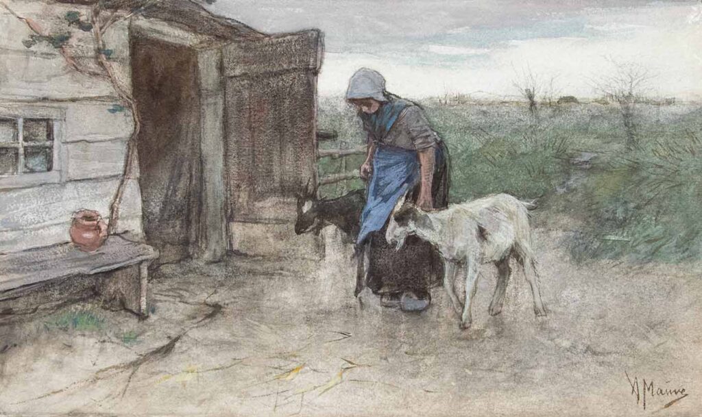 Zij brengt de geiten naar de schuur