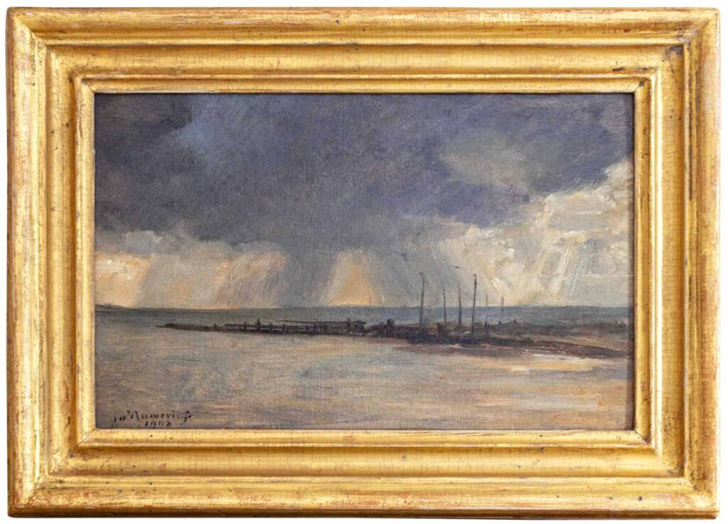 O. d’Aumérie (Waalwijk 1865 – 1962 Leiden), olieverf op paneel, 14 x 21,5 cm, gesigneerd linksonder en gedateerd 1908, met annotatie op achterzijde VERKOCHT