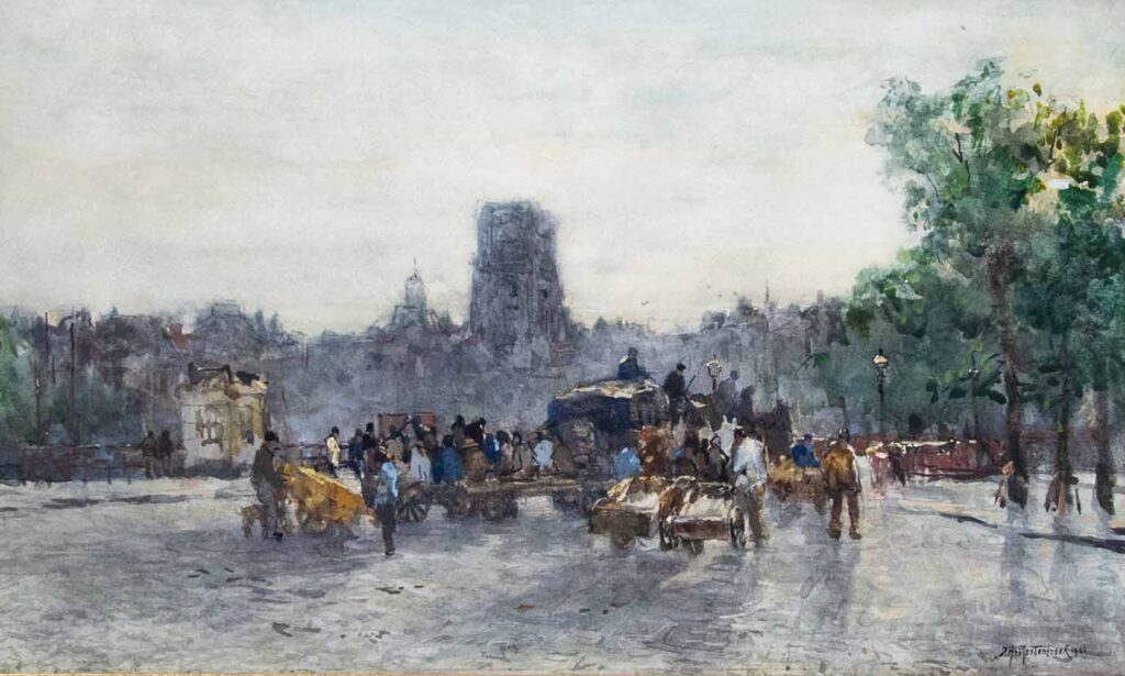 J.H. van Mastenbroek (1875 – Rotterdam – 1945), aquarel, 21 x 35 cm, gesigneerd rechtsonder en gedateerd 1906, annotatie achterzijde: ‘einde der dag’ met signatuur en 1906 VERKOCHT