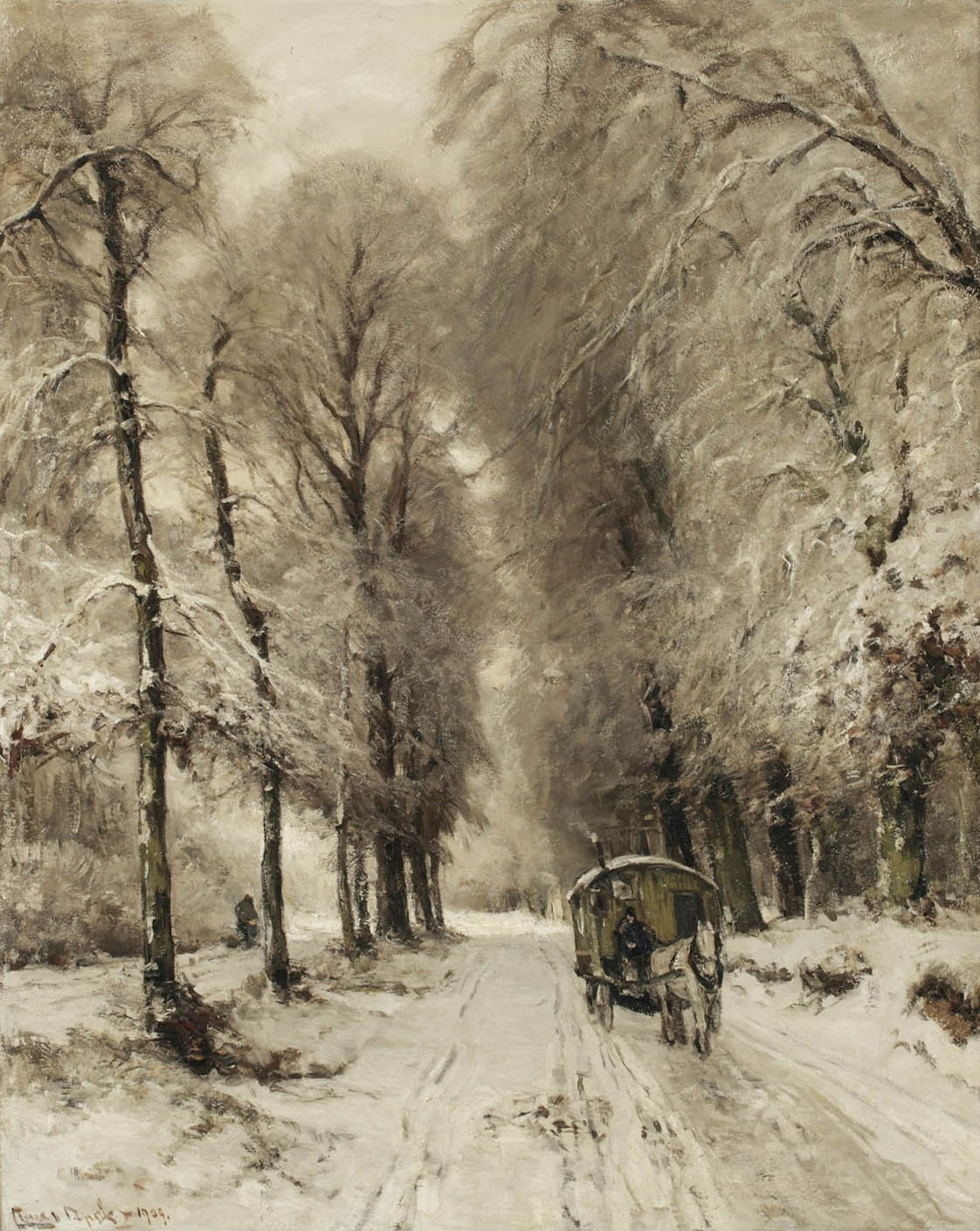 Een paard en wagen op een besneeuwd pad in het Haagse Bos