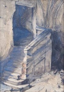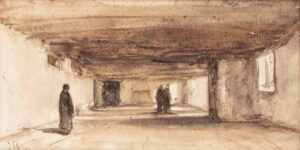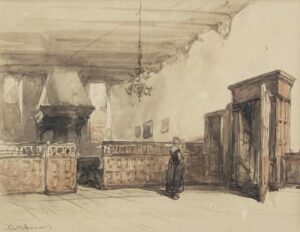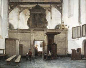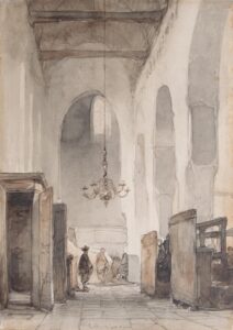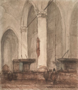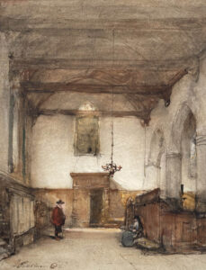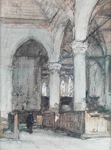 Johannes Bosboom is vooral bekend om zijn schilderijen en aquarellen van kerkinterieurs. Na zijn opleiding bij Bartholomeus van Hove, een architectuur- en genreschilder, vestigde hij zich al snel als zelfstandig kunstenaar. Zo zeer werd zijn werk gewaardeerd. Zijn schilderijen kenmerken zich doordat de kerkruimten uit een echt Hollands licht/donker contrast zijn opgebouwd. Tijdens zijn reizen door het Rijnland en door Frankrijk maakte hij vele schetsen die hij later zou verwerken tot eigen gecreëerde composities.